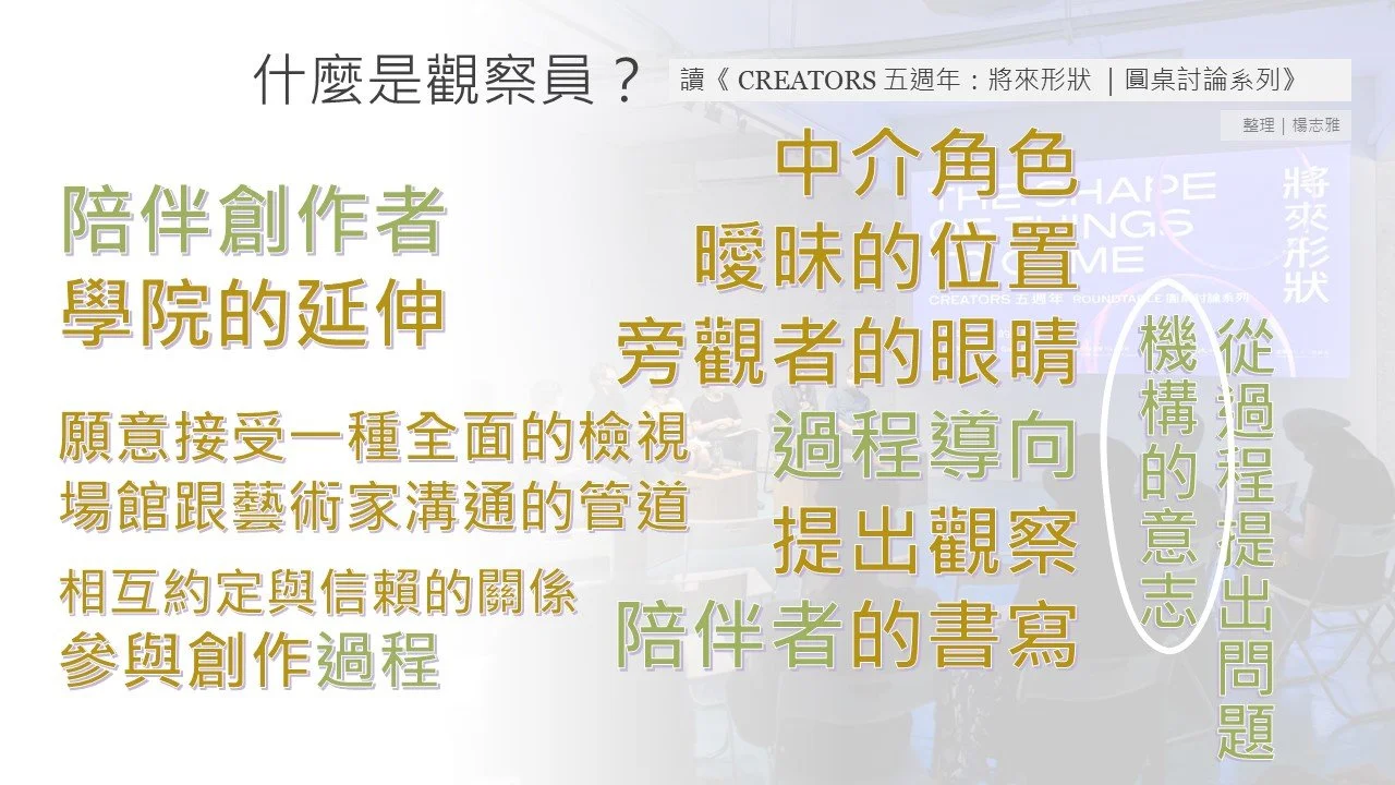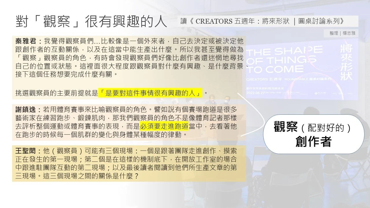 從上述三篇文章,首先挑出針對觀察員之關鍵描述,發現當CREATORS創作支持系統趨近成為後學院的延伸變體,觀察員像是一種可能為導師、抑或是同儕的陪伴角色,在機構、獲補助創作者、觀察員三方具有相互約定與信賴的關係之下,觀察員居中位處曖昧的位置,用相對靠近又保持一定距離的旁觀角度提出觀察,回饋給雙方。CLAB的CREATORS計畫一直以來強調以過程為導向,非以創作成果定論補助成效,而這樣的無形培育過程仍需要被記錄評估,就得靠觀察員的文字描述,和走進創作過程中向創作者「提醒」或者「提問」。